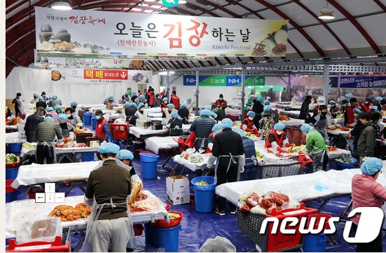 (서울=뉴스1) = 4일 오후 강원도 평창군 진부면 평창송어축제장 일원에서 개막한 평창고랭지김장축제를 찾은 방문객들이 평창고랭지 배추와 알타리 등으로 김장을 담그고 있다. 코로나19로 지난 2년간 중단됐던 이번 축제는 오는 20일까지 사전예약 또한 현장결제를 통해서 참여할 수 있다. (평창군 제공) 2022.11.4/뉴스1 photo@news1.kr